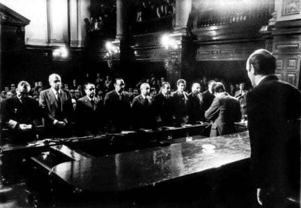 Lo imposible empezó a ocurrir a las 15.15 cuando entraron de a uno, en hilera, Emilio Eduardo Massera, Eduardo Viola, Basilio Lami Dozo, Leopoldo Galtieri, Orlando Agosti, Isaac Anaya, Rubén Graffigna, Armando Lambruschini y Jorge Rafael Videla.
